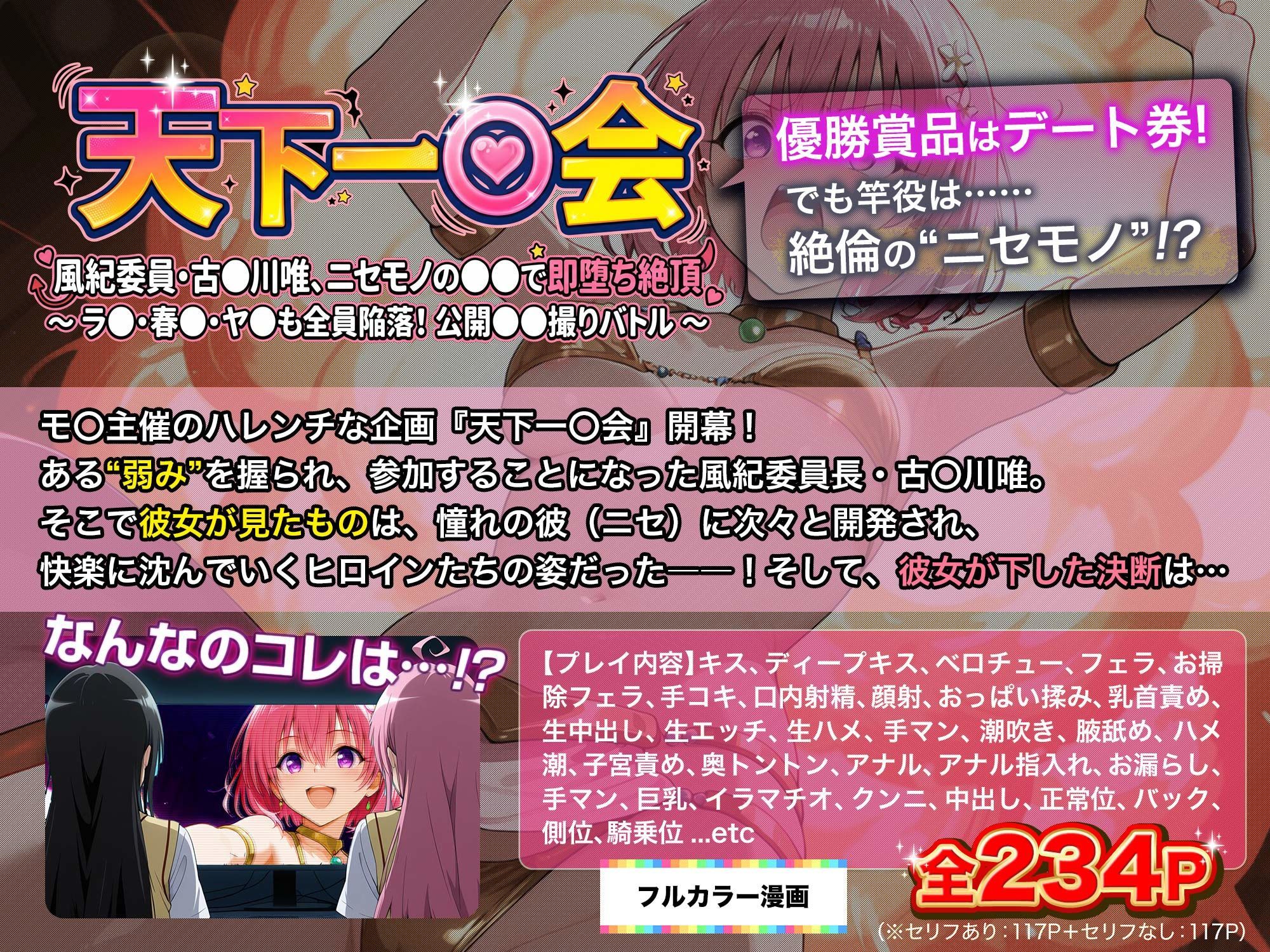| タイトル | 【天下一○会】風紀委員・古○川唯、ニセモノの巨根で即堕ち絶頂 〜ラ○・春○・ヤ○も全員陥落!公開ハメ撮りセックスバトル 〜 |